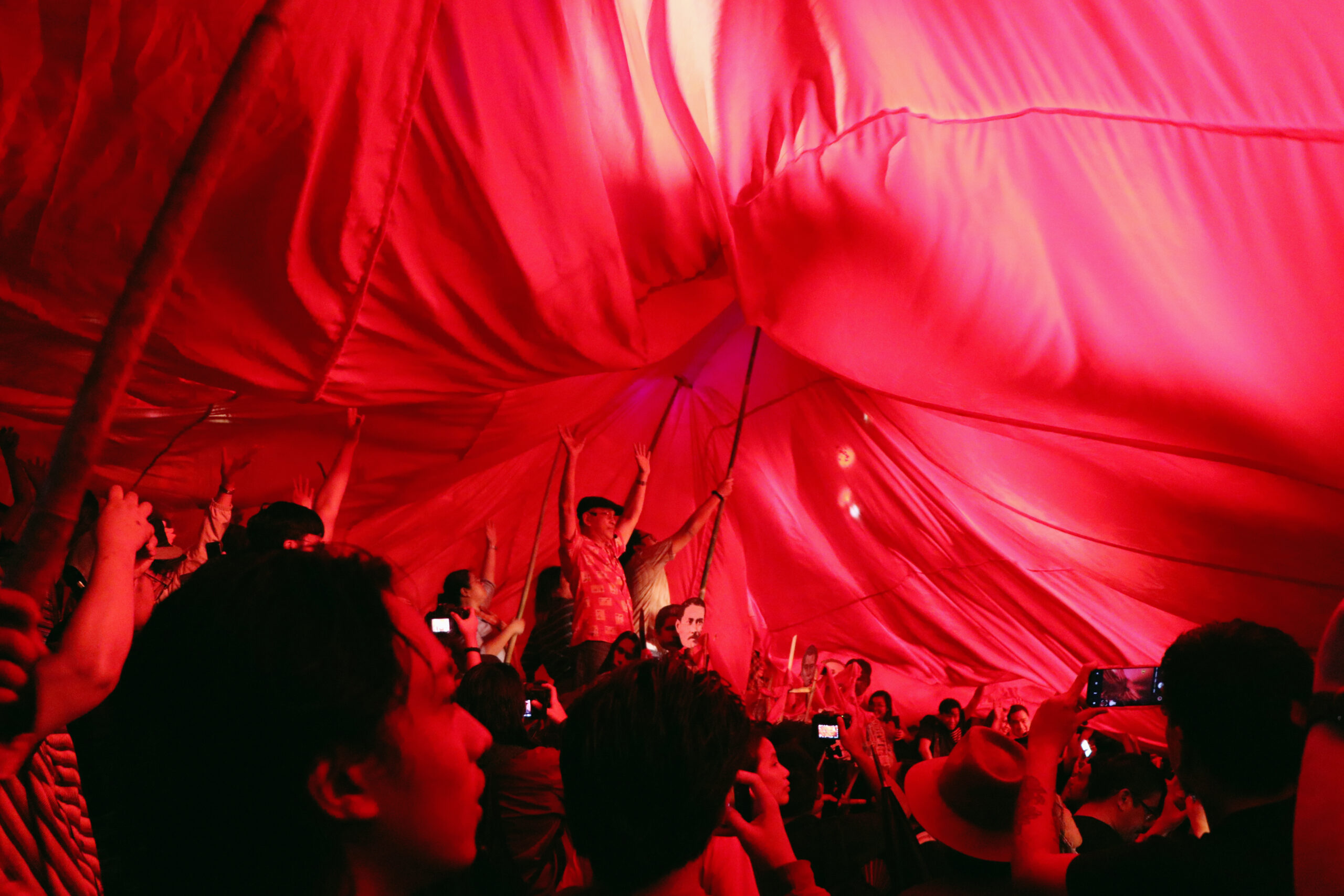 Artist Zeke Sales ends a performance with a pose mimicking the Oblation during UGNAYAN’s launch